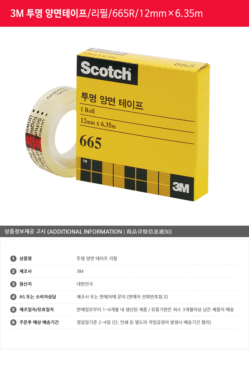 3M 투명 양면테이프 리필 1개/665/12mmx6.35m