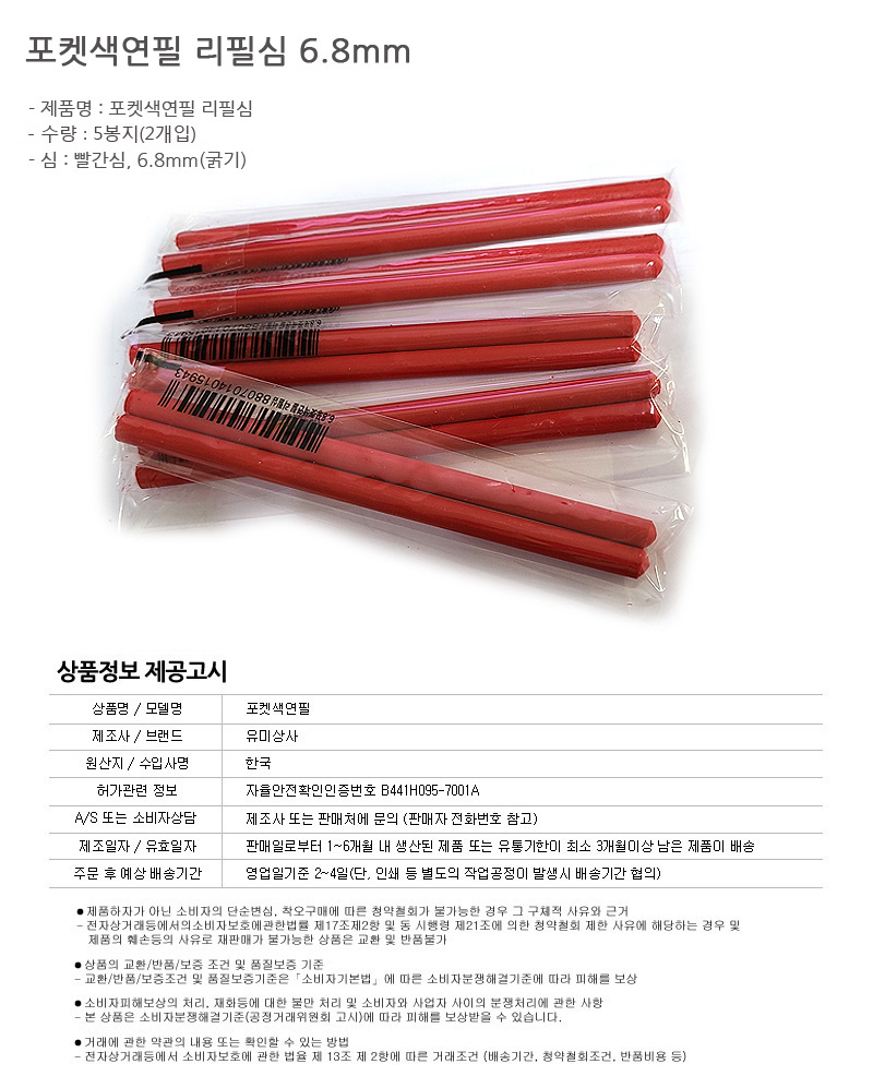 유미상사 포켓색연필 6.8mm 리필심(2개입) 5봉지